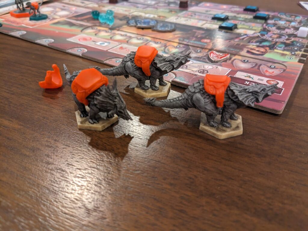 I’m also not going to spend much time here telling you about the ridiculous components in the box. It’s a Mindclash game, so IYKYK. Suffice it to say that Mindclash produces bits as fancy as anyone in the tabletop business, and that trend line continues with the Perseverance sequels. I will say this much–I didn’t think the world needed board games with dinosaur saddle pieces…and, I was wrong.
