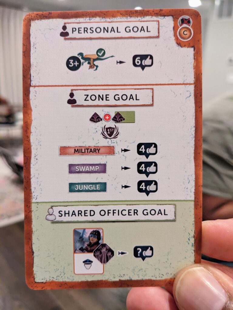 What I didn’t love here was the rules bloat. Perseverance: Castaway Chronicles—Episode 3 is as complicated as its title, with a teach that will take an hour and a playtime that approaches 45-60 minutes per player. The iconography takes a couple games to really parse, and turns can be pretty sizable. A player’s primary action, then secondary action (which might, if a player uses an Officer favor, become just as involved as a primary action), then adventure stage resolution (complete with two Threat rolls at the end of an adventure to determine how many Rangers and/or dinos a player might lose) could take 5-10 minutes, minimum…and that’s not including an Assembly scoring, if a player triggered one on their turn.