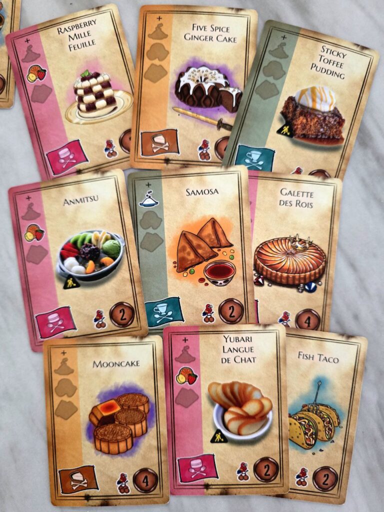 Each tea has two set requirements (specific ingredients, colors, etc.), and if players can satisfy both, they’ll receive a higher payout. Players can also “smash” cards by tucking extra cards behind the delicacies. This won’t result in higher scores, but it can help satisfy additional requirements to earn the combo bonus.
