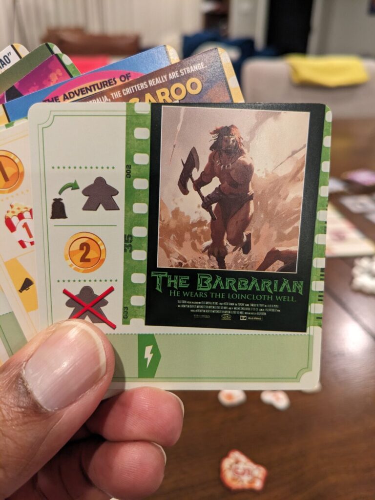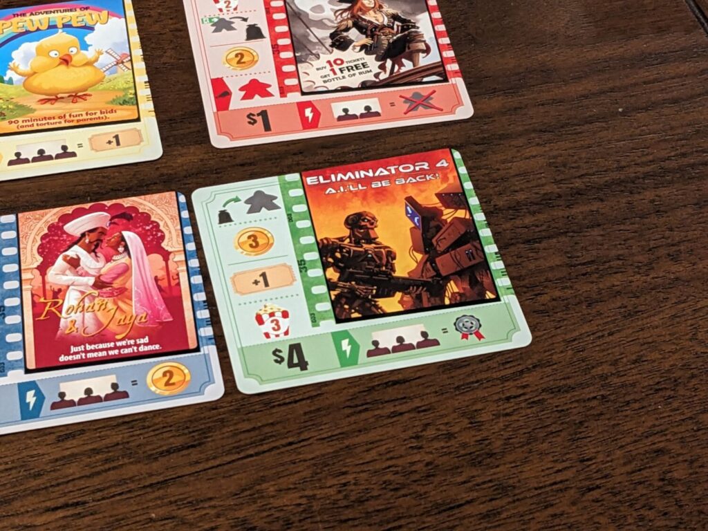 In my two-player game, my wife won by a solid 15-point margin, and she didn’t even maximize her Audience number. But every time she could, she matched a patron to the right movie and took popcorn bonuses as her movie bonus. She also was savvy enough to recognize that the best movies to take are the ones that score popcorn more often than other cards in that first play.