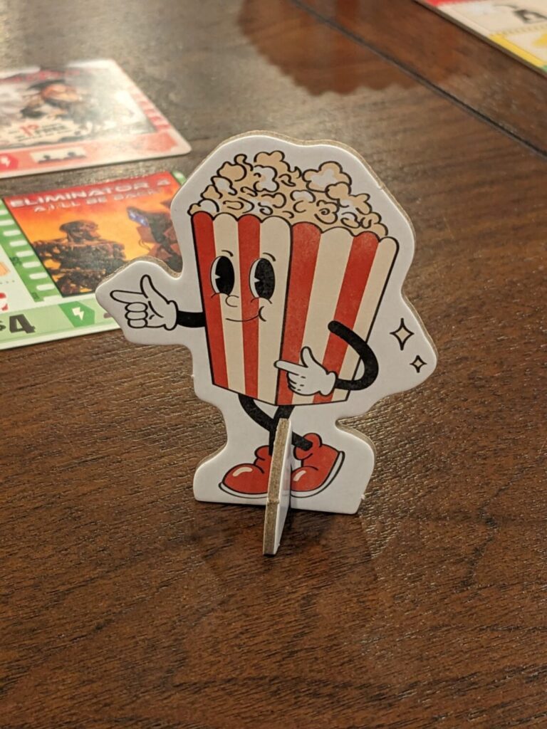In the game Popcorn, players operate a small movie chain that asks players to line up new features in their multiplexes, handsomely represented by each player’s personal board. Within each ‘plex, players can screen up to three movies at a time, in theaters that range in size from 1-3 seats. Movie fans come in a range of flavors and must be attracted to your theater to watch movies to generate points, known here as popcorn and appearing as cute, cardboard popcorn tokens in 1-, 3- and 5-point increments.