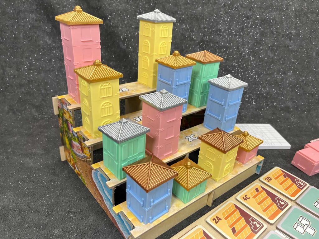 Positano is as breezy as the weather on the Amalfi coast, and you’ll likely spend at least some of your time admiring pastel blocks and tiered play area. You see, Positano has what we at Meeple Mountain call Builder’s Satisfaction. This is a term we coined many years ago to indicate a game whose final state is unique, distinct, and satisfying to achieve. Positano is an attractive game and bigger than it ought to be, with large colorful pieces, and at the end you look at this cardboard cliffside and perhaps imagine what life might be like if you were a member of the wealthy elite who could afford a home such as this.