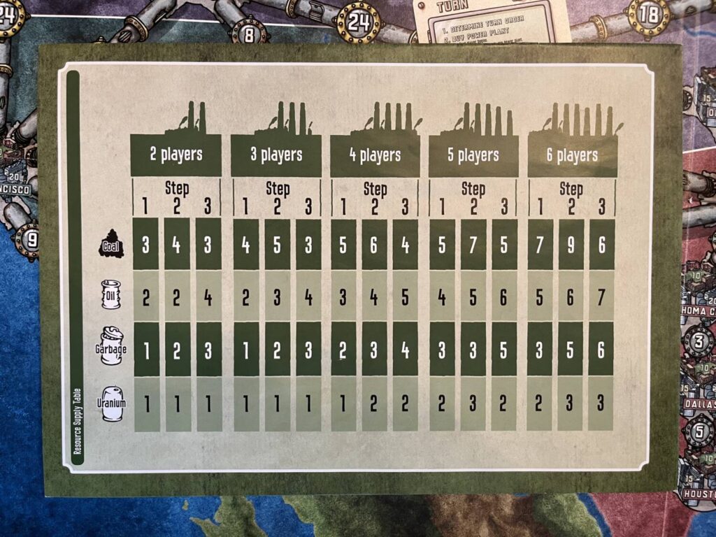 There is a chart in the rule book that you’ll reference throughout the game. It details how many of the game’s resources you put out for each round. These numbers depend upon the number of players and the phase of the game, so check the chart before setting out the initial offering of the four plant-powering resources—coal, oil, garbage, and nuclear—for your player count along the bottom of the board in the indicated areas.