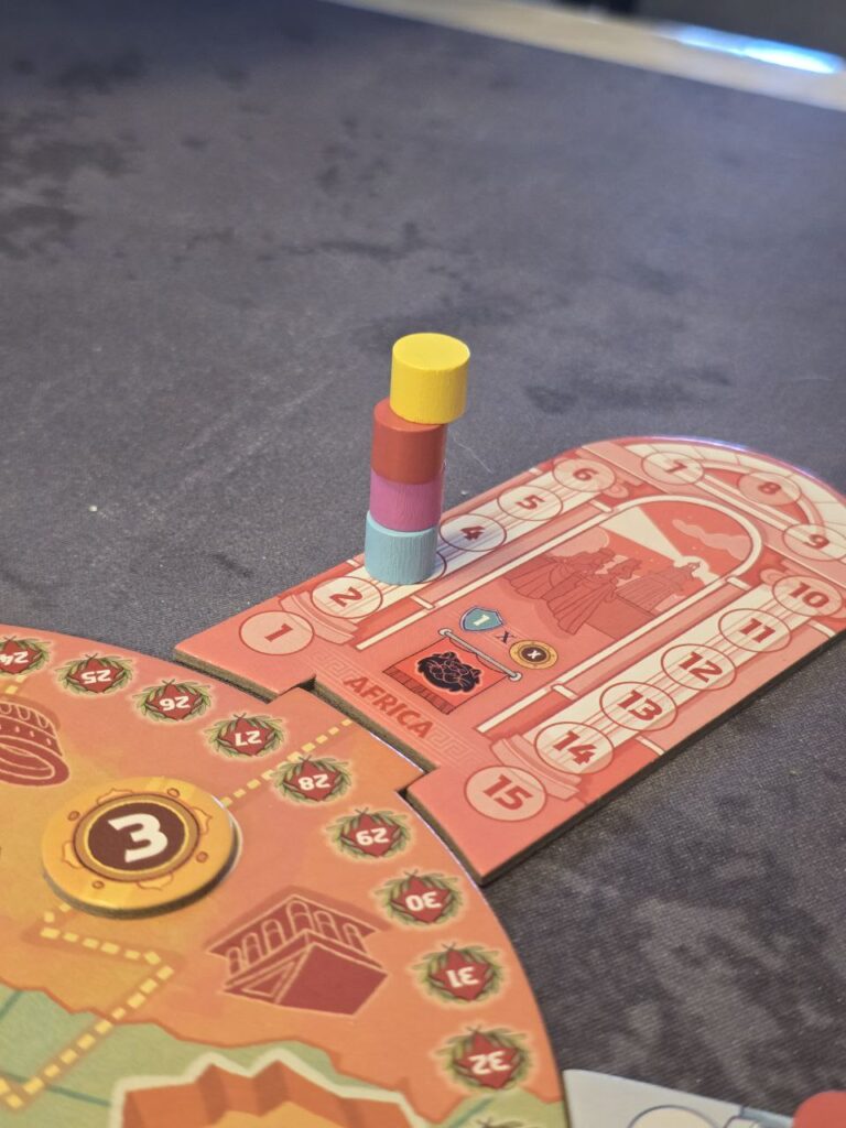 The game features six provinces, each representing a different region of the Roman Empire (Gallia, Macedonia, etc.), and each province corresponds to specific card types for scoring. Every time a player plays a card, they advance on the related province track. The player leading on a track will multiply their collected cards by that province’s influence value, while the second-place player scores at a slightly lower rate, and so on—until the influence value reaches zero.