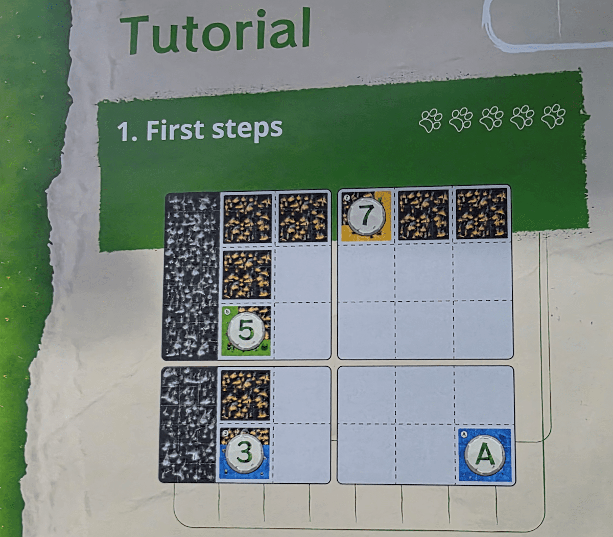 Race to the Raft includes a scenario book with more than 80 scenarios which are part of a dozen campaigns. Given that the island boards (see above) are all double sided and can be rotated, you will almost never encounter the same setup twice. Each scenario has its own diagram explaining how to set the island up for the game. For example, this is the diagram for Tutorial Scenario #1: First Steps.
