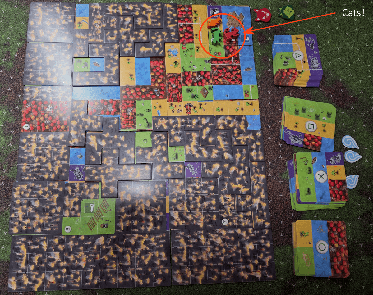 - Playing Cards—in any order, players may play cards. Cards are used for one of two purposes: adding pathways or moving cats.