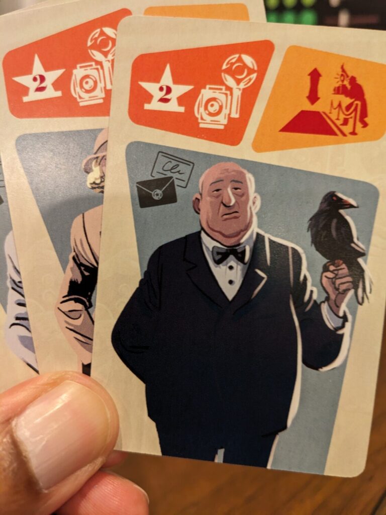 It is this final action that gives Red Carpet a devilish set of teeth, for a game that initially looks like a family-friendly “let’s take pictures of cute cardboard standees” experience. That’s because the movement options on each card can be diabolical in the hands of people who previously doubled as either friends from my game groups or even my wife. (She’s still my wife. At least, that was true at the time of this post. We are knee-deep in another game of Red Carpet, so…we’ll see.)