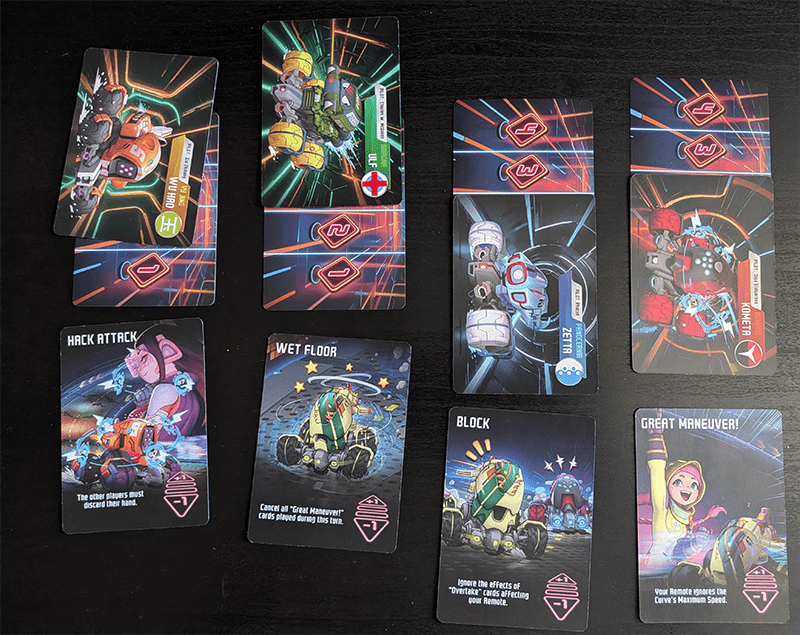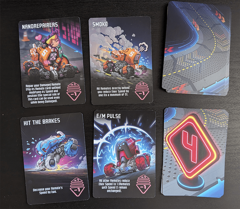 A few examples illustrate the problem. Smoke reduces the speed of everyone behind you by 1, so if you’re at the back of the pack, the text effect is dead on arrival. E/M Pulse forces everyone else to drop their speed by 1, making it an obvious hold for the final stretch. Except Hack Attack forces everyone to discard their hand, which makes any long-term planning feel pointless.