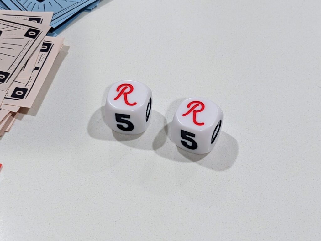 Any player starts by rolling two identical, six-sided dice. Each die face represents one of the five bill values, with a sixth face featuring a large “R”, which is a wild symbol. If the die roll ends up with two different values, players can take one bill from the pile matching one of the two rolled symbols. (If an R was one of the two die faces rolled, a player can use that to take any value bill into their Stake.)