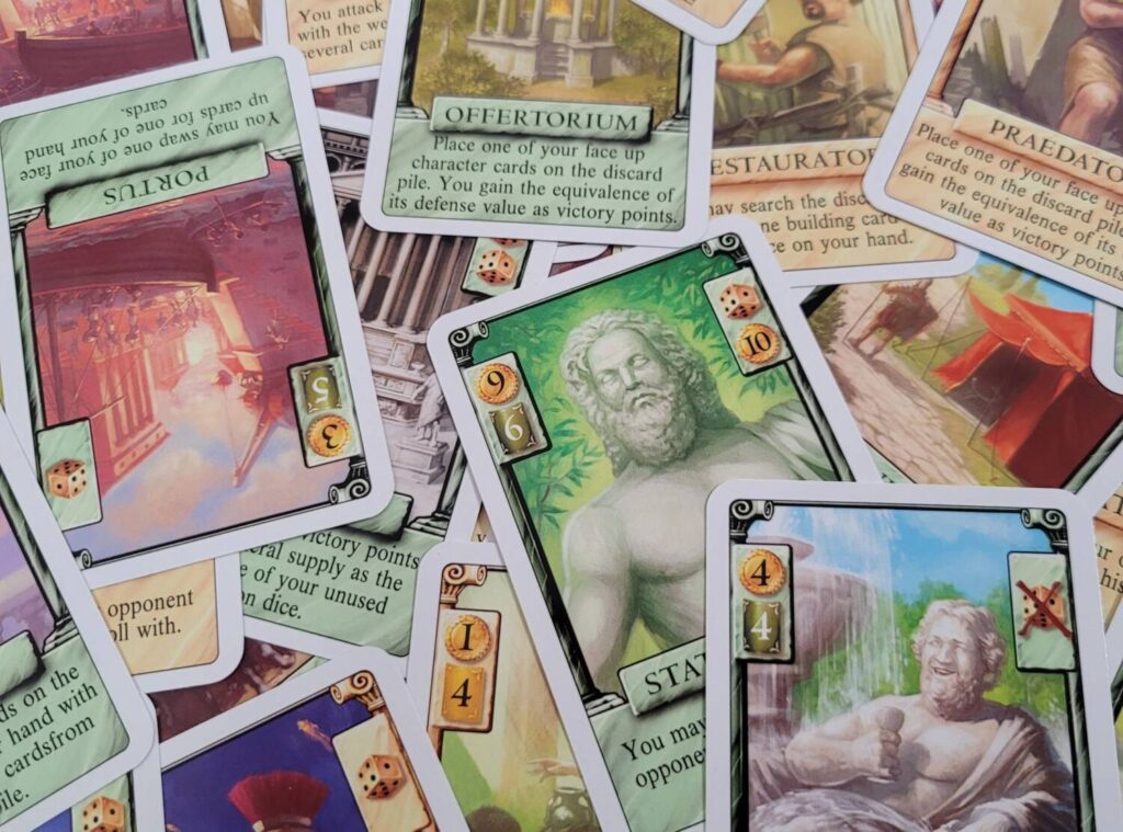 Not everything is sunshine and roses, though. I do have a few minor quibbles. For starters, the rule books across both games could have stood some additional editing. Not only is the wording inconsistent from one to the next (for instance, Roma tells us about the “Playing Equipment” while Arena tells us about the “Game Components”), but the card summary at the back of the Arena rulebook displays the incorrect text for the Forum card, re-using the text for the Fortuna card instead. Also, nowhere in the rules are the players told how to handle a game that ends in a tie. But, my biggest minor quibble is that, aside from a single character card in Roma—which, when activated, allows you to adjust the pip values on one of your dice—there is no method for mitigating your dice rolls. You are always at the mercy of the whims of fate.