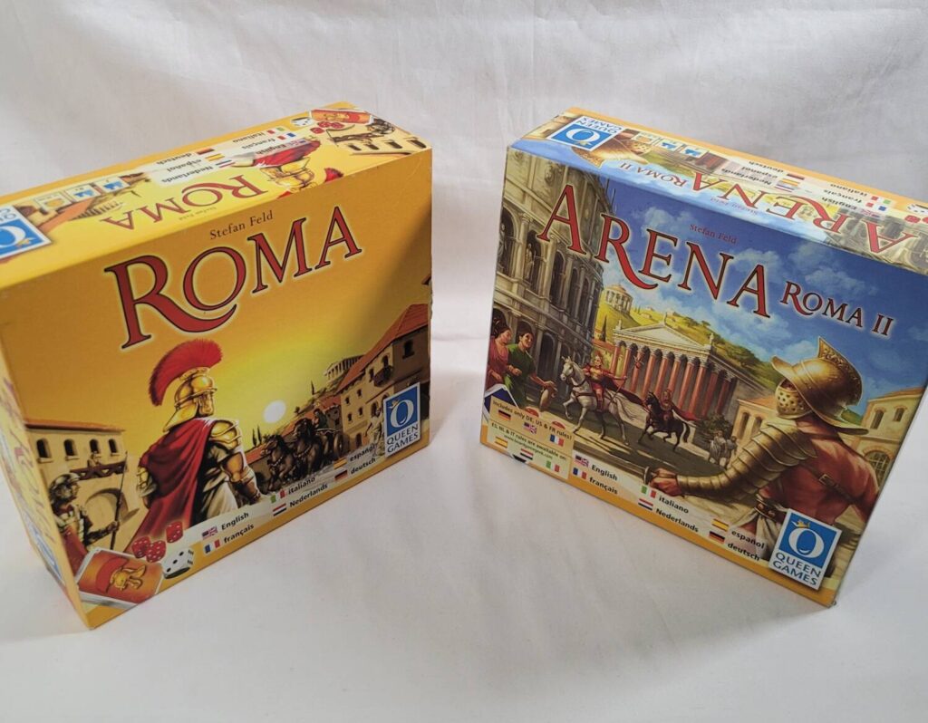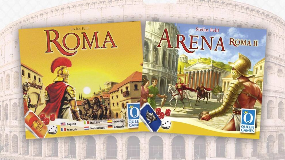 Today we’re going to talk about 2005’s Roma and 2009’s Arena: Roma II, his 1st and 6th games, respectively. Arena: Roma II (Arena) stands out as the first (and, so far, only) time that Feld has released a standalone expansion to a previously published game. Folks that only own one or the other of the two titles can enjoy them separately. Or, if they own both, they can be mixed together in one of several ways for a different experience. These two games also stand out as Feld’s first and second partnerships with Queen Games, a partnership which still flourishes to this day.