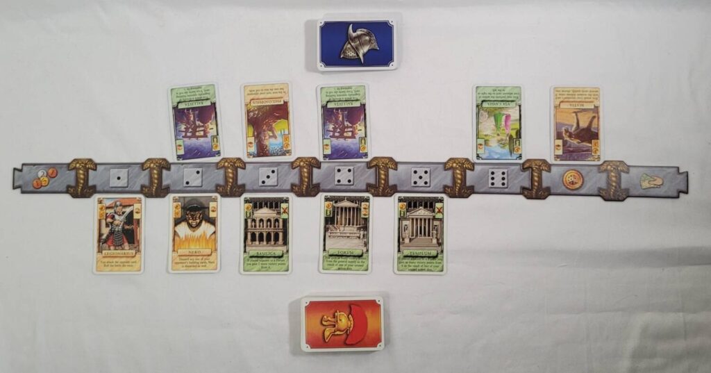 As stated earlier, when it comes to Roma and Arena, there is no appreciable difference between the two. But, if you tasked me with recommending one or the other, I’d lean more towards Arena over its counterpart. The production value is slightly better, the bribery space provides flexibility that Roma is lacking, and it removes the pointless setup condition from Roma which has the players placing their cards face down. If you were guaranteed to be able to activate a specific card at any given time, this restriction would make sense. But, since the activation of any given card is entirely dependent on the roll of the dice, there’s really no need for it.