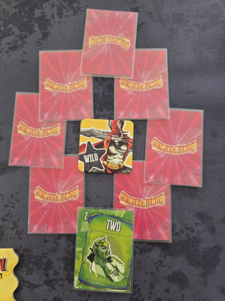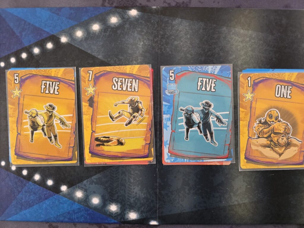 When playing with fewer than four players, one player controls a “headliner” (a wrestler with more health) and a manager, who has no health but offers a special power. The manager’s hand is represented by a tableau of facedown cards with a single face-up starter. The headliner can draw from both their own hand and the tableau, unlocking the manager’s power halfway through.
