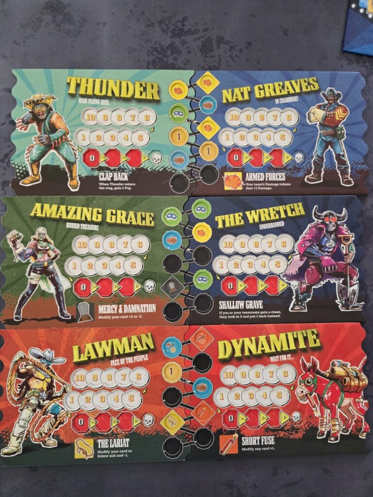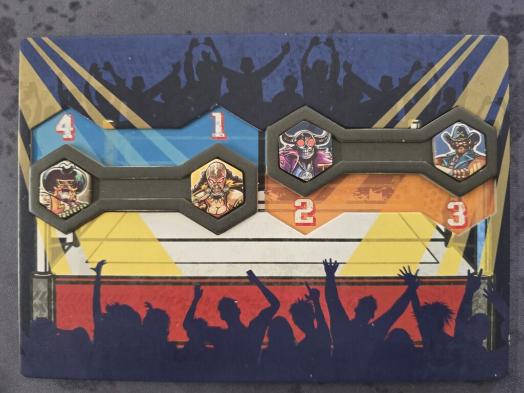 Players attach their wrestler boards to form a shared “pop” track. Each wrestler also has a health track, with their final segment split into three “stops,” mimicking a three-count pin by halting any over-damage three times.