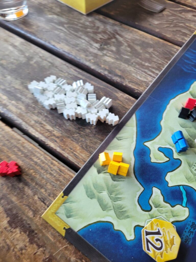 It’s simple. There are eleven territories, with points numbered 2-12. You want to win them so you can win the game. On your turn, you roll three dice. You sum two of those dice to determine the territory, and the third determines how many armies you put out. There are tiebreaker tokens that go to the players who place all their armies first, and tactics cards that you can use instead of rolling the dice, though each player can only use one per game. They just do the occasional maneuver.