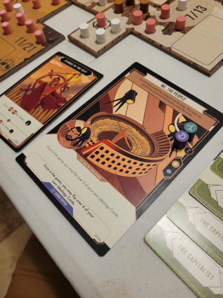 If players manage to defeat the imperials, there’s a check on the game state where you determine the top two ideology cards across all player tableaus, and players vote on a set of rules based on those top two, representing the new society they have formed. This is my favorite part of the experience.