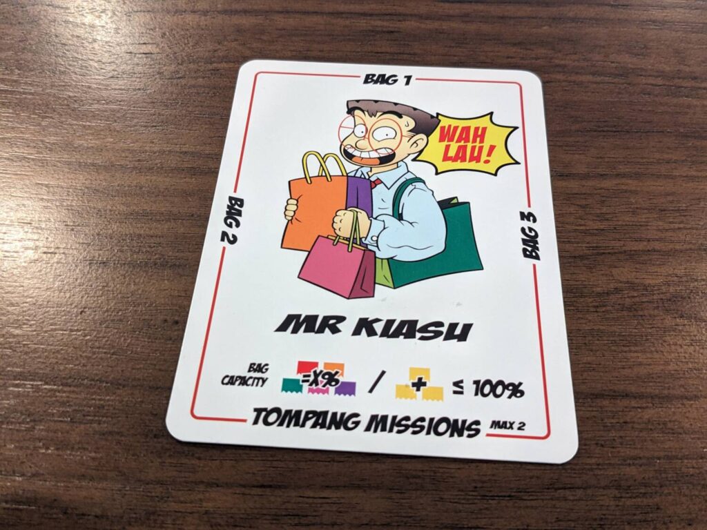 When three rounds are up, players get points based on the size of the discounts on their cards, by converting shopping cards into points that range from 1-6 points per card. Also, every Tompang card scores five points if a player meets its scoring condition—but loses three points for every card they can’t fulfill. Across my plays, scores ranged in the mid-50s to the mid-80s, and the math wasn’t too hard to figure out by the end.