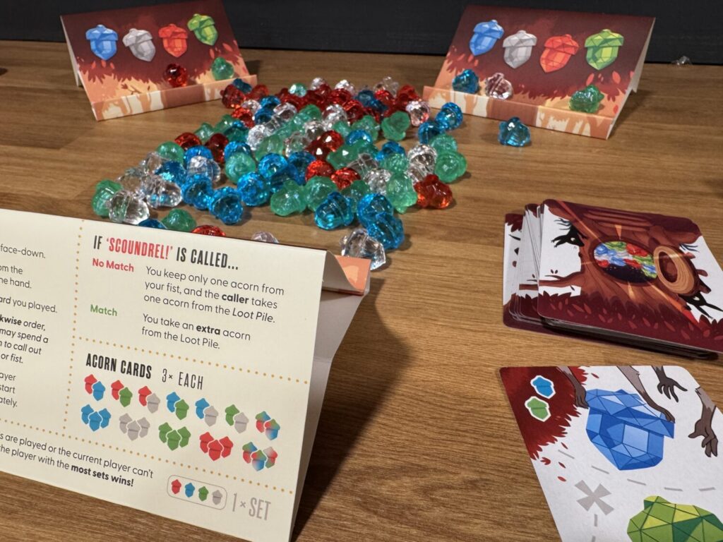 If any player thinks that you aren’t being entirely truthful, they place one of the red Scoundrel tokens on the source of your lie, whether that’s your closed fist or the card. Then, you reveal. If you were telling the truth and were called out, you keep what you took and also receive an extra acorn as compensation. If you were caught lying, you keep one acorn and give one to the accuser as a reward for their observation skills. If you aren’t called out, you keep everything you took, whether you were truthful or not.