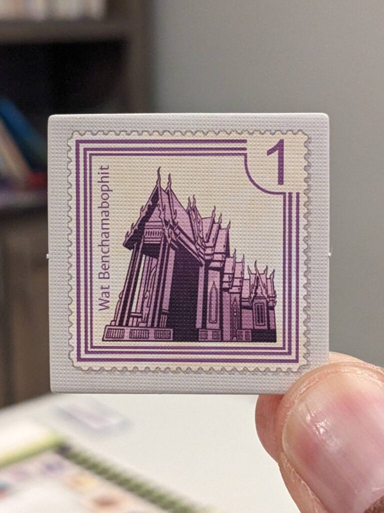 But space, monuments, and vehicle themes were a little harder. In our five-player game, we got physically close together to pick stamps, so close that I thought I was cheating on my wife. (Stamp Swap would not have been a good pick for early COVID game nights, capiche?)