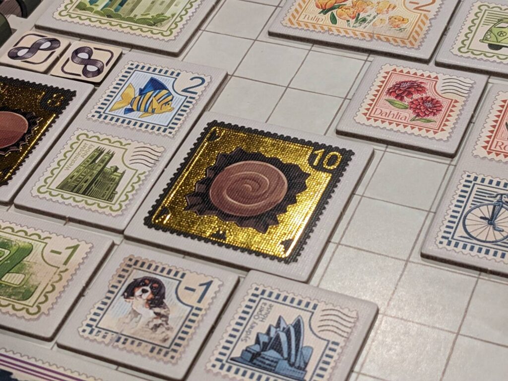Then players take their winnings and quietly place their stamps in their notebook, a simple cardboard player mat. The choice of using a standard sheet of cardboard to serve as the notebook was an interesting one, because it doesn’t stop a player’s stamps from jostling around when a player inevitably knocks a previously-placed stamp out of place. Ditto for when someone accidentally bumps the table, knocking stamps slightly out of position.