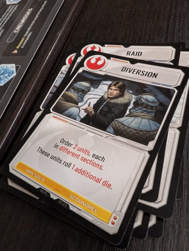 The fact that the game is set within the Star Wars universe (as opposed to World War II) may be enough for some to choose one over the other but there are a few additions that make Battle of Hoth stand out from Memoir ’44, and I would say it’s a mixed bag. First off, are the leader cards. There are 3 sets of 3 cards for both the Rebel and Empire sides, featuring well-known Star Wars characters, and you can optionally add one set of these (more powerful) cards to each command deck. My issue is that these cards are similar (if not identical) to cards in Memoir ’44 that are already in the standard command deck. There is no reason not to play with them. It honestly felt a little cheap, like they simply needed a way to add Han Solo and Darth Vader to the game.