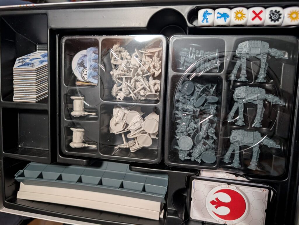 Another small but significant upgrade is the box insert and, specifically, the container for the miniatures. This was by far the most frustrating element of playing Memoir ’44, which used a thin, amorphous plastic blob to hold all its minis and was nearly impossible to close without wanting to tear your hair out. Battle of Hoth, by contrast, contains two sleek little boxes with lids (one for each side) that perfectly house all the miniatures. I should note that a new version of Memoir ’44 (dubbed “Refresh”) was just released recently, which I have not seen but which promises a “redesigned plastic tray”, so clearly Days of Wonder realized this was an issue.