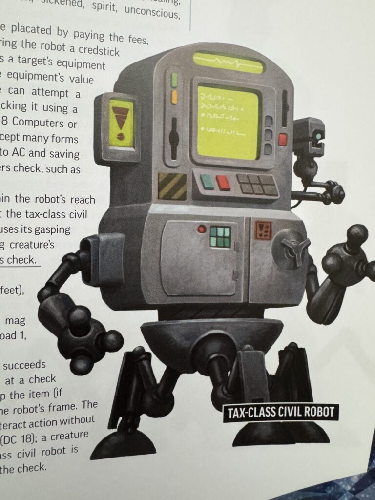 While a campaign riddled with bureaucracy and paper-pushing seems moderately enticing, this entry led me to a character concept of a debtor who purposefully keeps the civil robot around, mostly to soak up the energy blasts from plasma rifles. Perhaps they’ve developed a certain form of friendship because of constant interaction or due to some reprogramming or glitch in the system. I could see them also coercing or persuading the robot that their enemies have high outstanding debts, for a nominal fee.