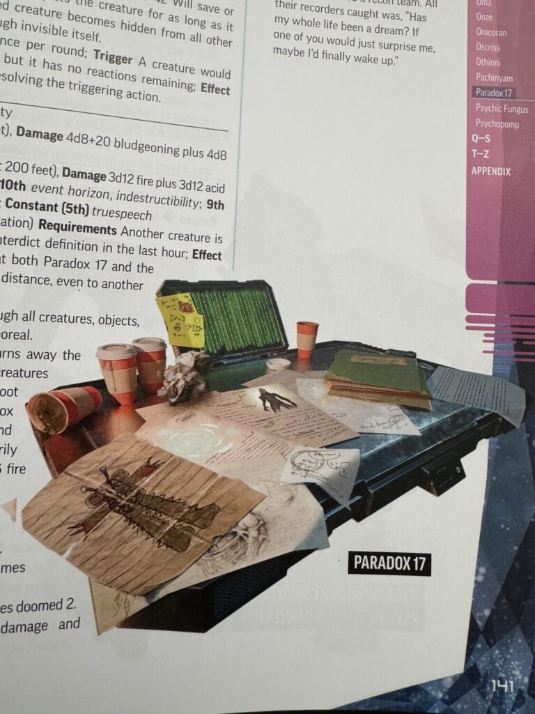 Even the art for this creature is just a desk littered with notes, spent coffee cups, and that telltale vibrant green digital rain on a touchpad. The creature is naturally invisible and can travel instantly to anybody who has had a revelation about its existence in the past hour. It takes an absurd Will save to even witness Paradox 17 if it’s floating right in front of you. It is not something to be trifled with.
