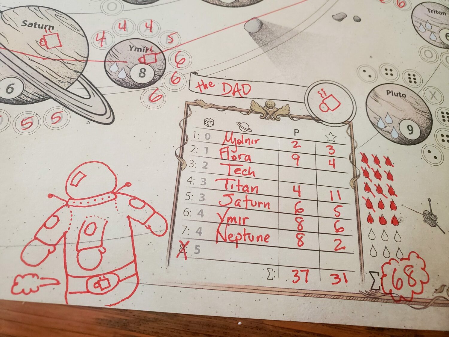 Solar System has been a great success thus far. My kiddos love chucking handfuls of dice. They love purchasing even more dice to chuck. They love visiting the aliens of Tau Ceti, scoring big and then being generous with their water supply to score even more. They love busting out the pens and the ruler. They love drawing their chosen icons on every planet they visit. Much like Moomin, they occasionally allow their creative wants to trump their competitive oughts, and I love that.