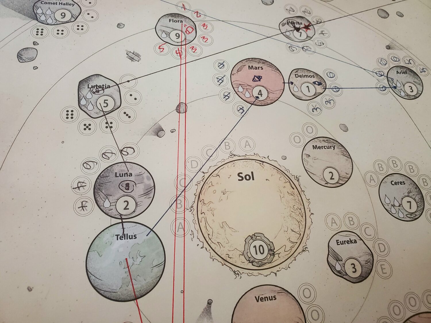 The paper is antiqued in color, which renders the pencils less legible. In asking players to write, draw, and trace lines, the tips dull too quickly and some of the colors wash out against one another or the printed page. As a result, we switched to colored G2 gel pens for our second play and never looked back. It’s so much easier to write and to read. Because the background is, well, space, there’s no real loss from the missing colored pencils. Instead of coloring, we’ve taken to drawing aliens, ships, and space garbage around the board as we play.