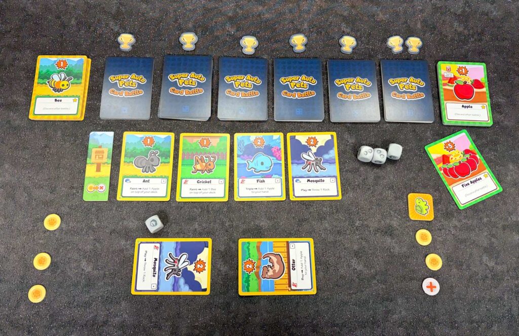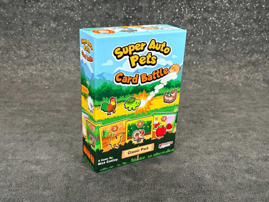 So, who is this game for? People already familiar with the IP are one group: in addition to the browser game, there are iOS and Android versions, as well as a Steam version. But Super Auto Pets Card Battle will appeal to any kid who enjoys cute animals. My son has loads of stuffed animals, loves our foster kittens, and adores cute things in general. So when we opened the box, he just shuffled through the deck, exclaiming at the kawaii (Japanese for “cute”) on display.