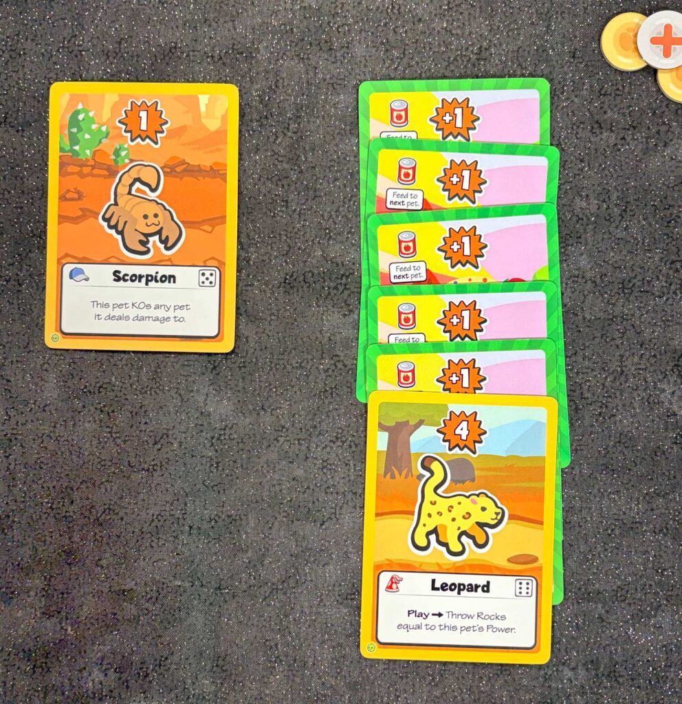At the beginning of each round, players take turns purchasing pets from a selection of 4 cards. Once each player has three cards, they arrange their pets in whichever order they like, preparing them for battle.