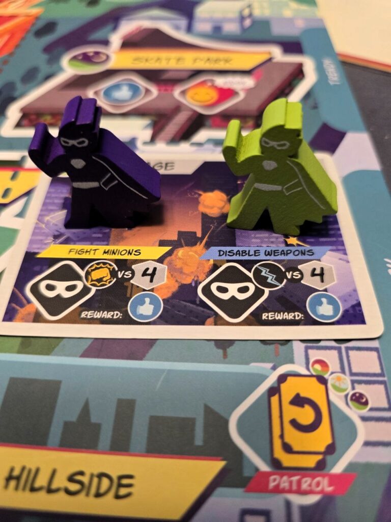 Players pick a hero type and power, fusing them into a superhero identity. (Catchy names are essential) Each type comes with unique asymmetric powers that can be activated anytime by spending tokens earned throughout the game’s activities—studying, hanging out, or fighting crime. Powers are enhanced further with costume cards that add a fun deck-building element. Players place two superhero meeples per time slot, but actions are limited, so plan wisely! Homework matters, too—fail your classes, and the team loses. Completing assignments earns checkmark tokens, which fuel superpowers. But school isn’t the only challenge—crime is always lurking!