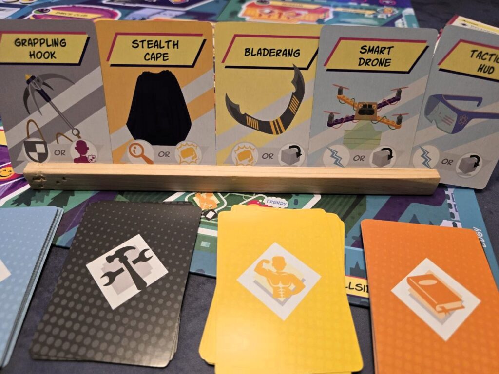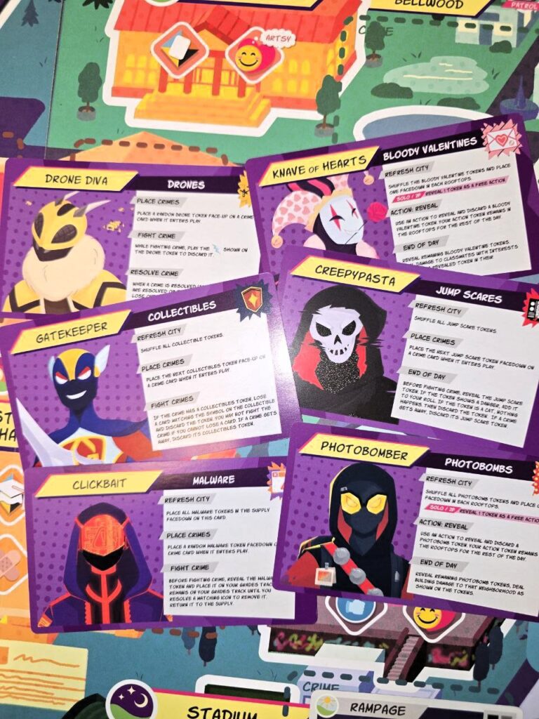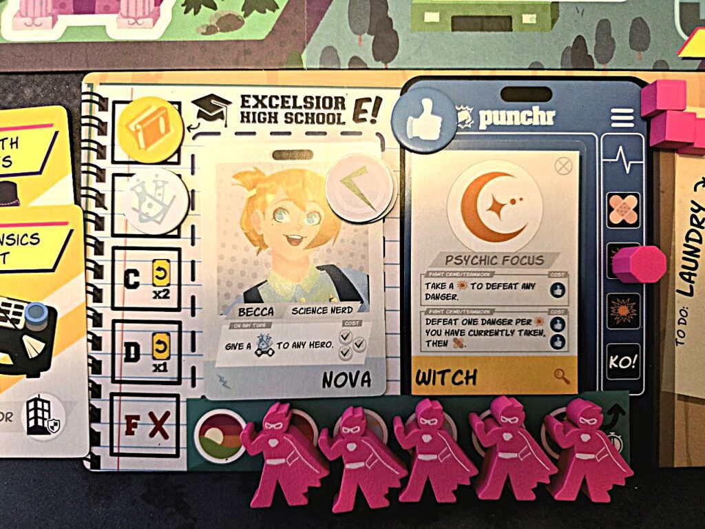 The game lasts five rounds, each representing a school day split into morning, afternoon, and night—because even superheroes have a schedule. Players win by defeating the villain but lose if the crime deck runs out, if a player starts a round with an “F” (failing algebra and the city is too much), or if all five damage tokens are used (superheroes aren’t that tough). At the end of each day, students get some rest, action spaces cycle and a new round begins—until victory or disaster strikes.