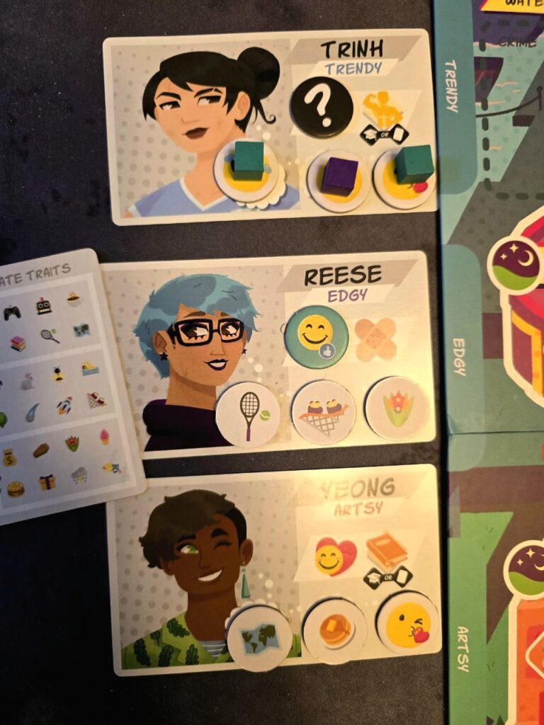At night, players can hang out or date, answering themed questions about their classmates. Guessing correctly strengthens the bond, unlocks new action spaces, and brings the team closer to unmasking the villain. Each classmate can have only one bestie or sweetheart, so claim your title while you can.