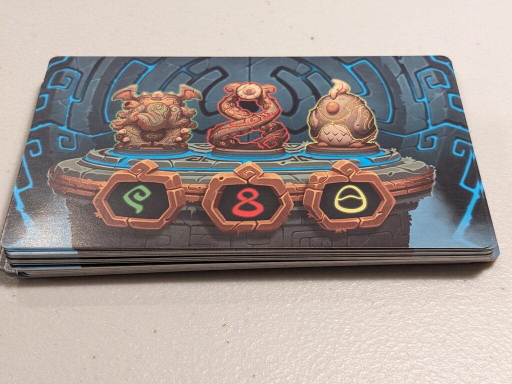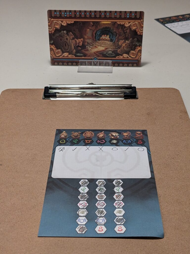 In multiplayer, players have a card facing their seating position that hides the answer to their personal “temple code” on the back side. The side facing the player shows a small combination that, when matched with any of the other cards, will provide hints as to the number and positioning of the symbols on the answer side. On a turn, the active player will select an opponent to look at one of the two clue cards in front of that player. The active player keeps one card and gives the other to that opponent, ensuring both now have a little more information to help solve their personal clue card.