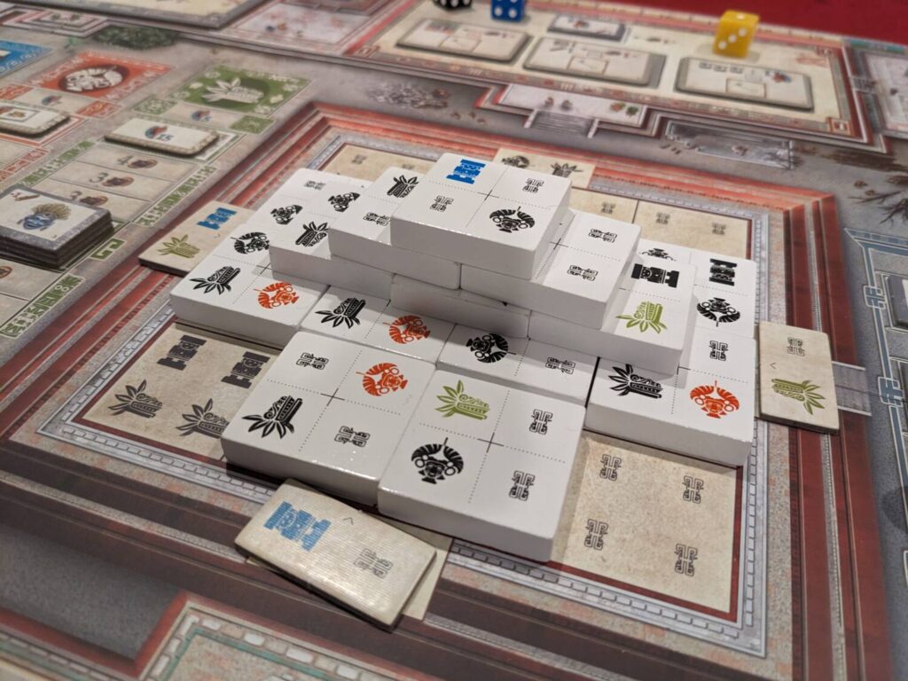 Board&Dice sent me a retail copy of Teotihuacan for this review, and everyone who tried the game said roughly the same thing: “these pyramid pieces feel deluxe.” Even now, seven years later, Teotihuacan feels like a deluxe Kickstarter edition. The wooden components could, and probably should, be smaller, but the chunky bits still work, especially the gold resources that stand out across a table (and serve as a reminder that your neighbor Wil is probably about to purchase a decoration tile on his next turn).