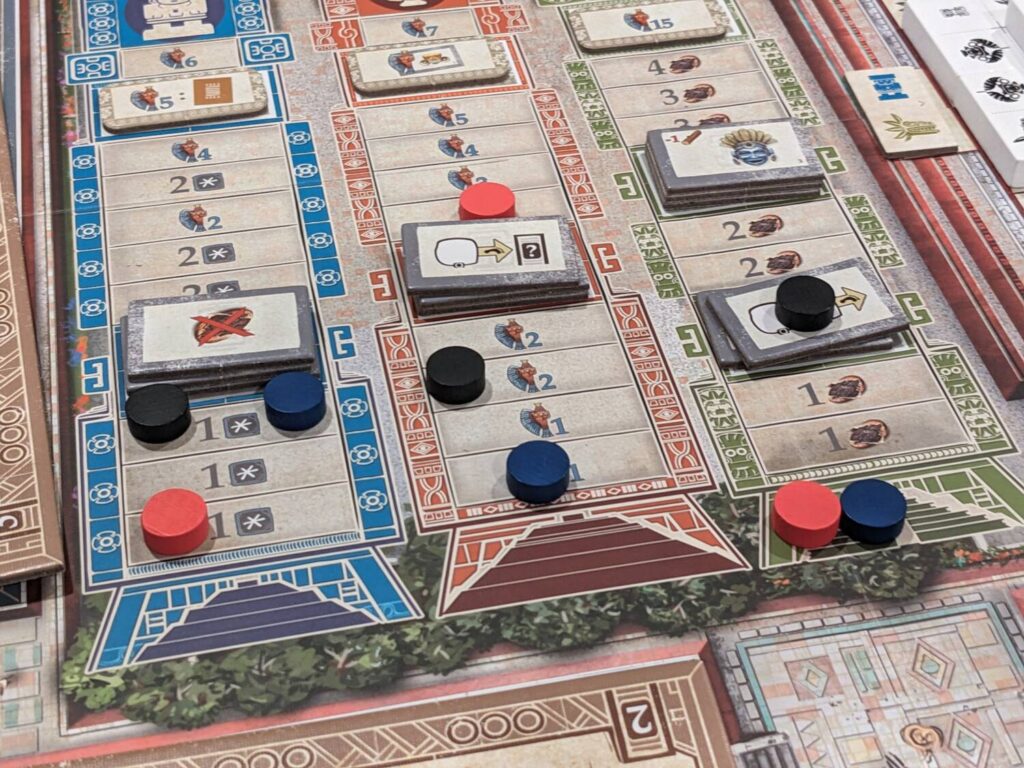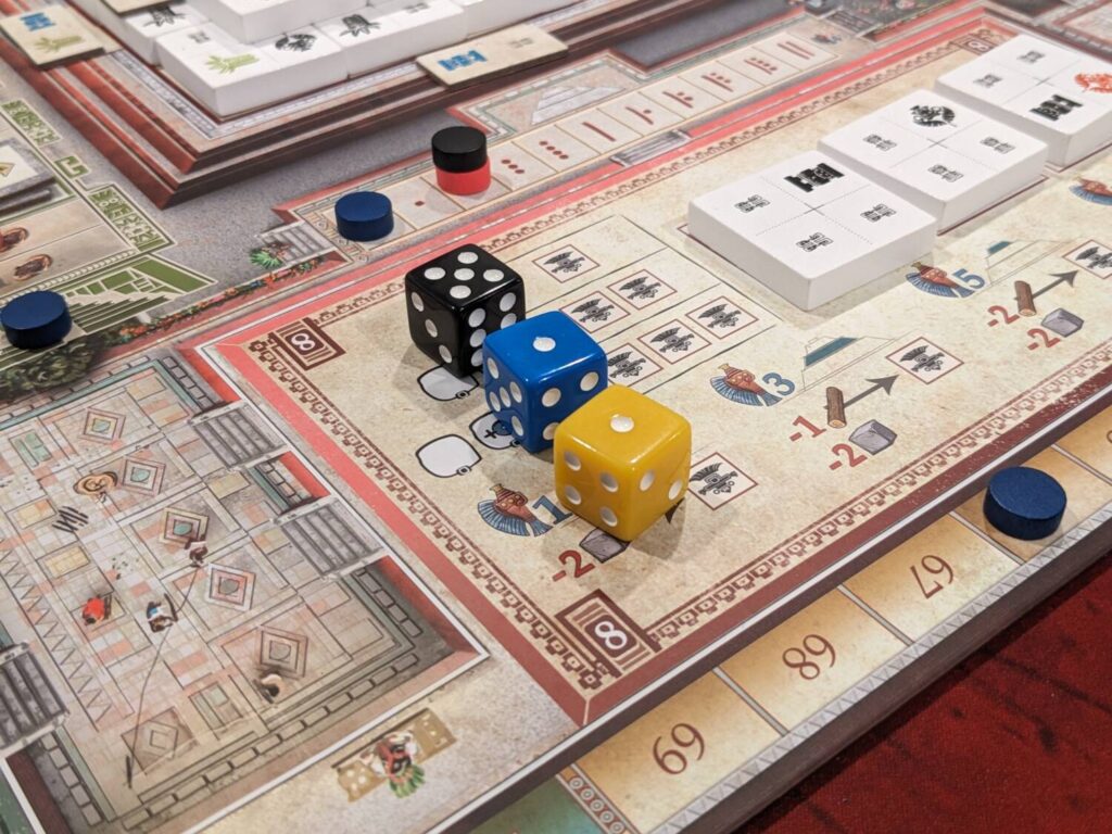 For a game with this level of strategic planning, that’s great news, especially because many of the turns are very fast. Downtime with three players is very low; the one exception to that came any time a player had to build either a pyramid piece or a decoration and needed to puzzle out where to place a tile to get track bonuses.