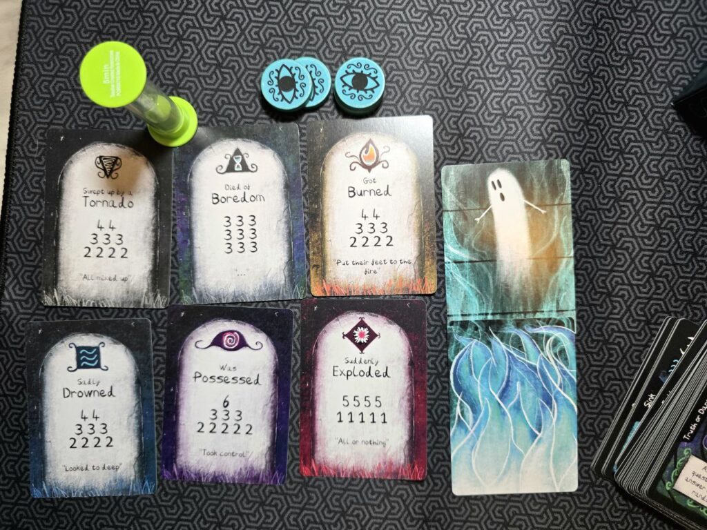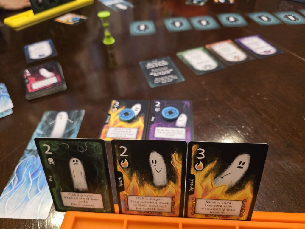 Players can also openly accuse others by placing the timer in front of them, though the accused player cannot move the timer themselves. Once time is up, all is revealed. If the group correctly accuses the culprit, the culprit moves their ghost tracker up one space. If they’re incorrect, the group takes the hit. The first player to move their tracker up three times triggers the end of the game, potentially resulting in multiple winners or losers.