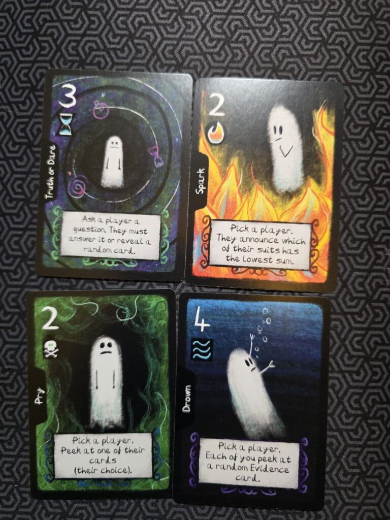That’s the Spirit plays in five-minute rounds where players work to deduce the culprit. Three cause-of-death cards are displayed, each with a corresponding deck of nine cards. These cards vary in value distribution and include an action. Cards are mixed and dealt to players at random. The remaining cards form the evidence deck, where the cause-of-death suit with the highest total value becomes the official cause. The culprit is the player (or players) holding the highest total value in hand of that same suit.