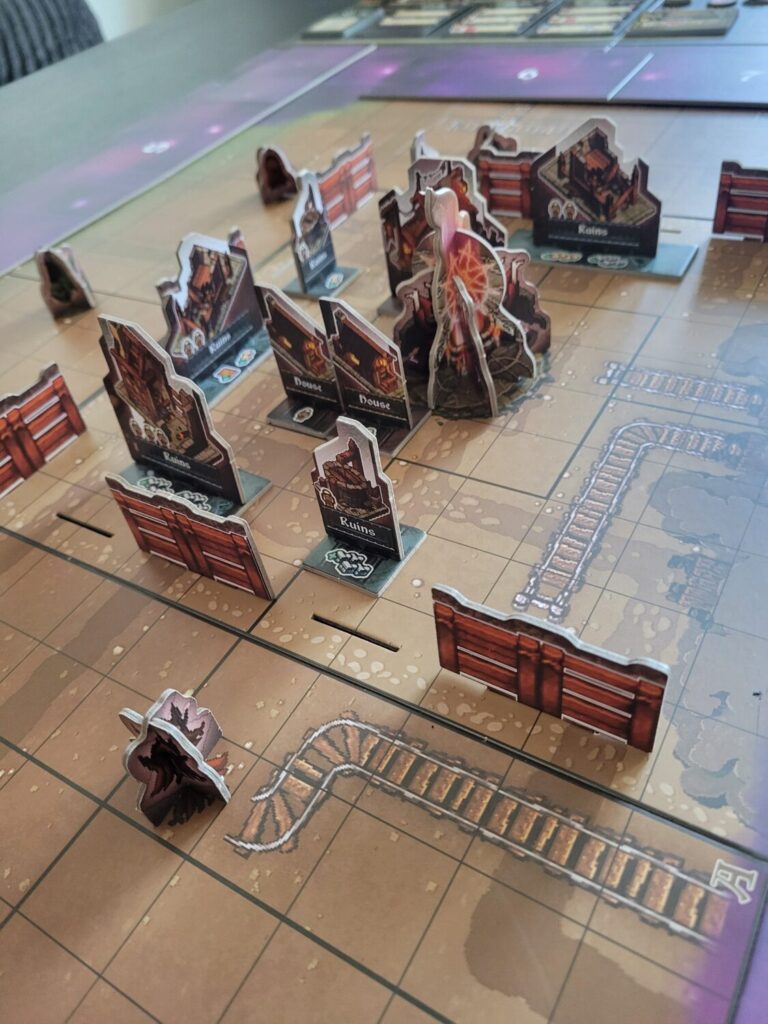 The game is a positional combat skirmish game where hordes of monsters attack your little town and you and your friends cooperatively fight back. Unfortunately for you and your friends, your town is a zillion cardboard standees with varying degrees of stability and visibility, and there’s about 200 more standees that make up the monsters that are attacking the town. Aesthetically cool, but reading is nearly impossible. There isn’t an angle from which you can view the board that you have a great vantage point to even play the damn thing from, which is just a failure in visual design.