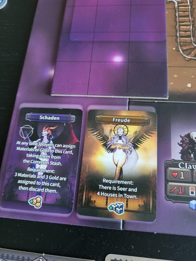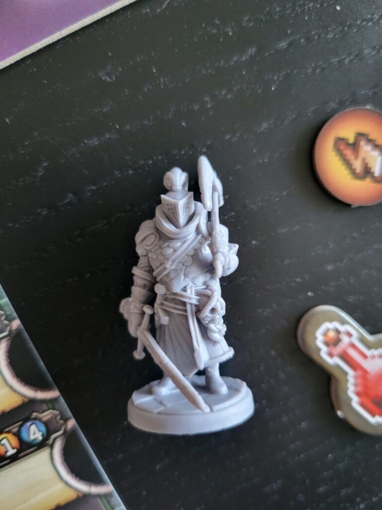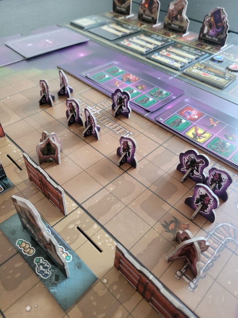 The premise of the game is that some wizards cast a big spell that killed nearly everything in the world, and the remnants group together in small towns bravely defending themselves against the dying of the light or some such thing. There’s purple mist. There’s a pixel art style that is very Dark Super Nintendo. Reminds me a bit of Super Boss Monster, and the text is reasonably easy to read. The miniatures for the player heroes are cool.