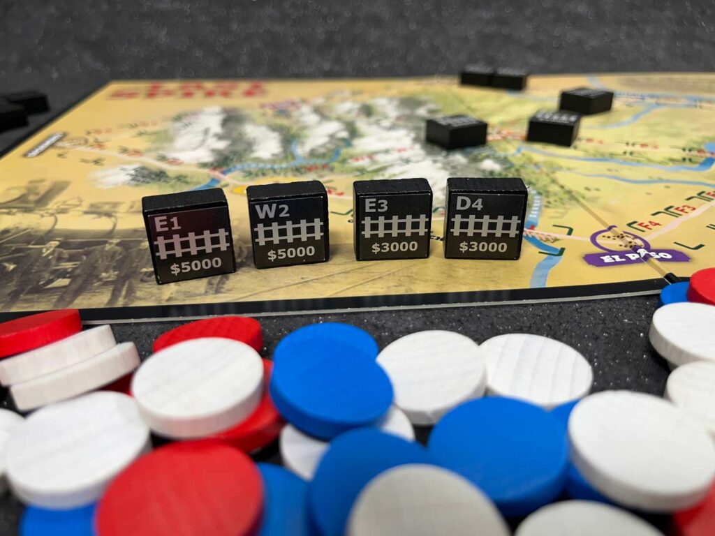It’s in your best interest to spread your net wide because you never know when a city is going to be completed. Some locations like Denver (at the intersection of 4 routes) could potentially pay out 4 times over a game, while other cities like Laramie or El Paso are a bigger risk because they each only have two incoming routes. But if you’re fortunate enough to draw sequential tiles then you can force the issue a bit and pick up multiple land grants that other players might not be looking at, with the knowledge that you can complete that route at any time for a quick payout.