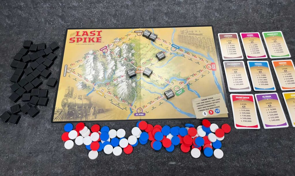 In The Last Spike players attempt to have the most money by the end of the game, which is triggered when “the last spike” is laid on train tracks which connect St. Louis and San Francisco. The “spikes” here are thick wooden tiles with specific locations on them: X1, Y3, D2, A4, etc. Each of these tiles can only be placed in one spot on the board; in between two cities on a map of the United States.