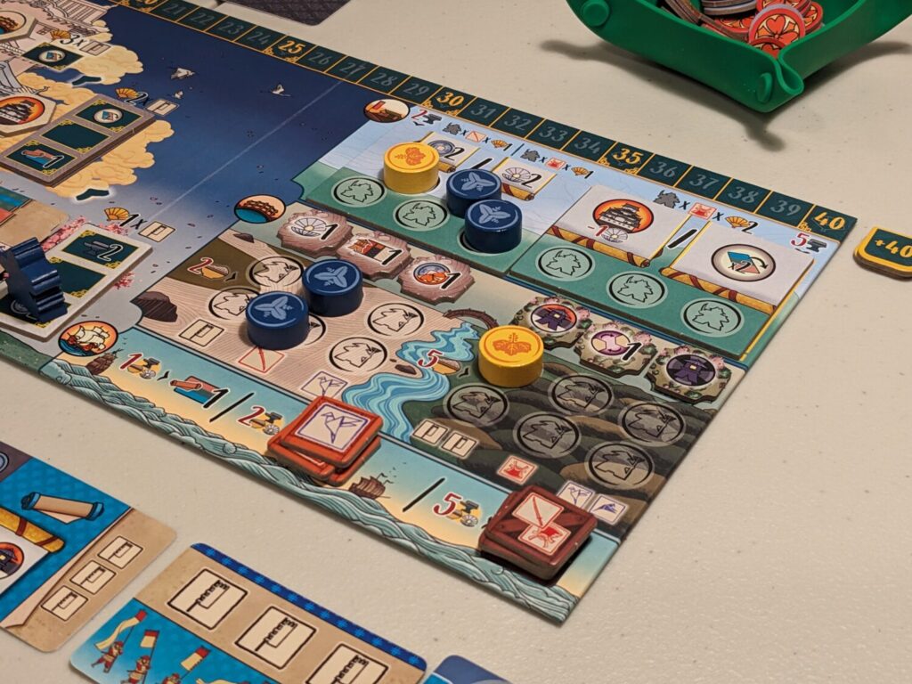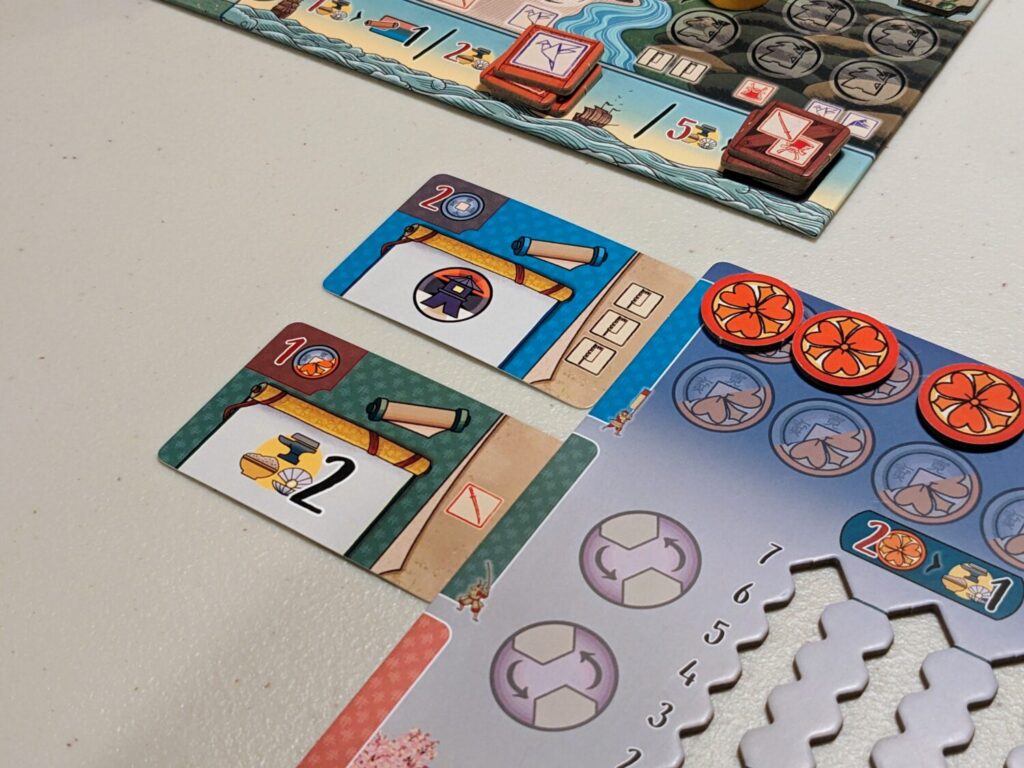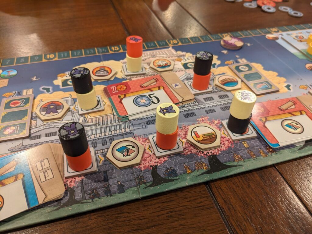 That means you might try to do what I now do during setup: I don’t “randomize” it at all, to ensure that lantern bonuses magically appear in all areas of the board. If you do this, you’ll have a much better chance at higher scores, because resources, money, Daimyo seals, and points will be featured much more prominently in your plays. (That 40+/80+ point token from the base game returns in the Duel version…but I really can’t imagine players tapping 80+ points without a seriously robust lantern engine.)