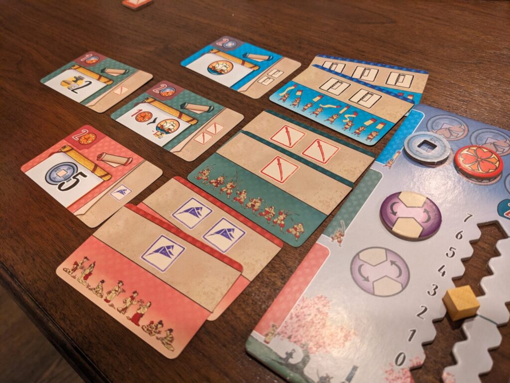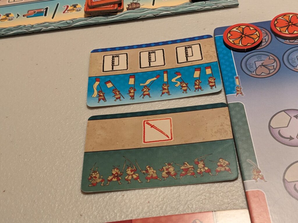 Beyond that, my only question mark regarding the experience is the use of coins and Daimyo seals in The White Castle Duel. In the base game, seals are strictly better than coins, because a seal can be used as a coin, and not vice versa. In both games, players can freely trade two Daimyo seals for one resource (food, iron, mother-of-pearl). But in The White Castle Duel, it seems clear in the rulebook that while only seals can be traded for resources, seals cannot take the place of coins any longer.