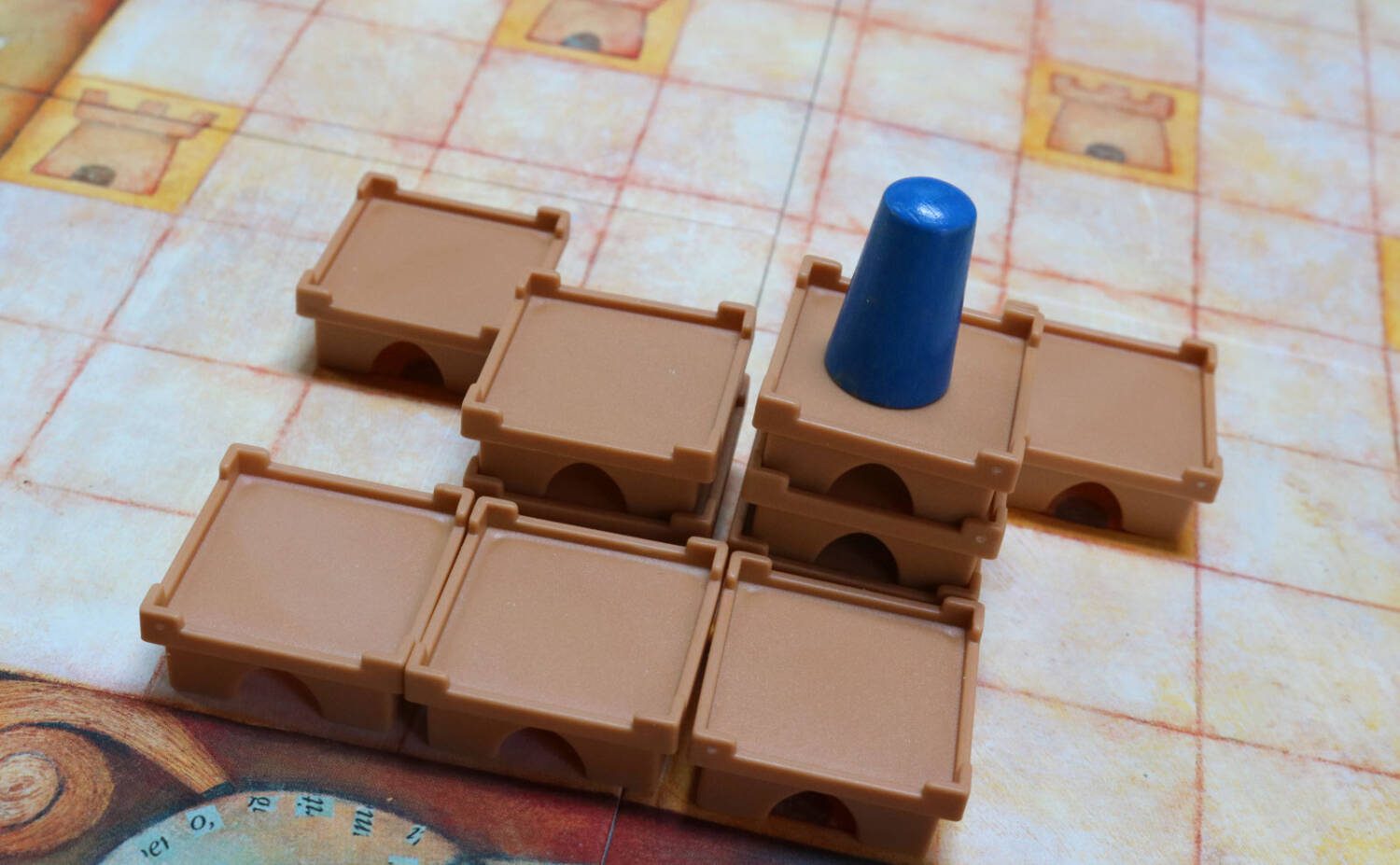 This is because, along with moving one space orthogonally across the board, Knights can also move up one level per action point. (Say, from the board to the first level of a castle; from the second level of a castle to the third, etc.) I’ll note here that you can add castle pieces to not only the castle(s) you started building, but any castle on the board. This comes in handy when you’ve invaded an opponent’s castle and want to climb up a level or two to increase your score for that castle.
