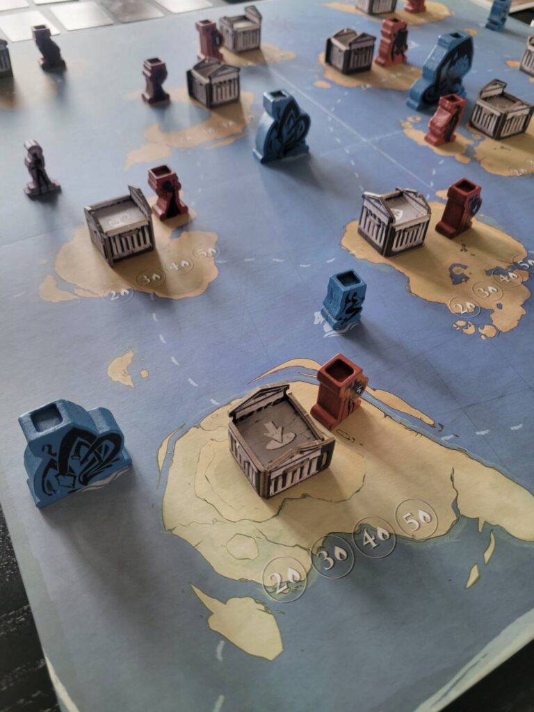 Trial of the Gods takes place on a map with islands and sea spaces. Players start with a single captain pawn that they move around, landing on islands and fighting monsters and defeating argonauts in single combat.