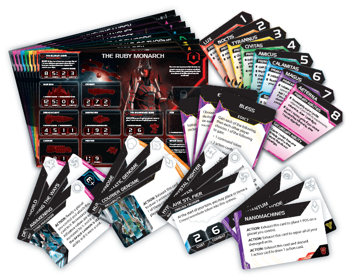 Twilight’s Fall takes place in an alternate future where each player becomes a mad Mahact king, stitching together a custom faction from the wreckage of the galaxy. You don’t pick a faction. You build one. Each king starts with a unique flagship and mech, and everything else is up for grabs. Abilities, unit upgrades, agents, and commanders are all spliced together from the game’s thirty factions to create a bespoke, Frankenstein’s monster faction sheet. Paradigms replace heroes as powerful one-shot effects. The agenda phase is tossed out in favor of an edict phase, where a single tyrant simply decides what happens. Research as you know it? Gone.