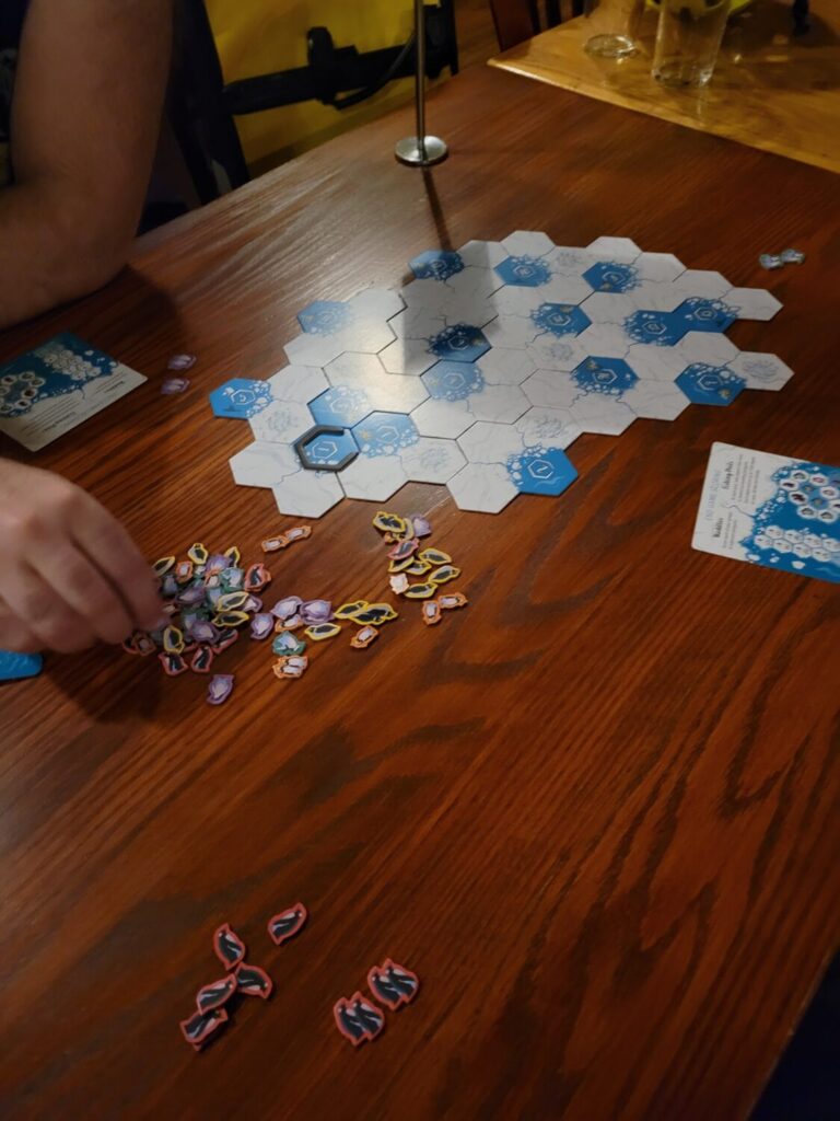That new round occurs when all the white spaces around the current water hex are filled with one penguin apiece. Then the marker hex moves to the water hex numbered 2, which may be somewhere else on the board. That’s mostly it. There are a few more rules about everybody scouting and the last player filling all the remaining spaces, but you do this sequence until every white hex is full. Then, it’s time for scoring.